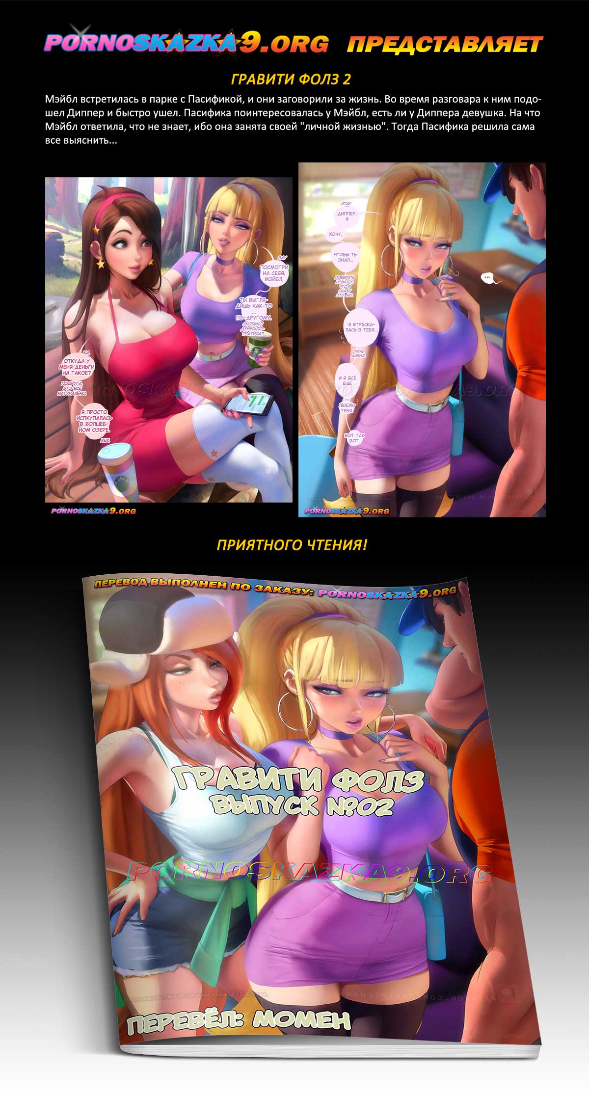 Порно комикс «Гравити Фолз. Выпуск 2.» Мэйбл встретилась в парке с Пасификой, и они заговорили за жизнь. Во время разговара к ним подошел Диппер и быстро ушел. Пасифика поинтересовалась у Мэйбл, есть ли у Диппера девушка. На что Мэйбл ответила, что не знает, ибо она занята своей «личной жизнью». Тогда Пасифика решила сама все выяснить…